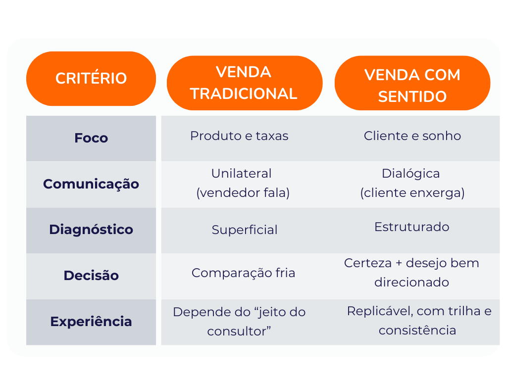 Quando o foco fica apenas em taxa e prazo, o cliente cai na comparação fria. Quando o consórcio é ligado ao objetivo real, a conversa evolui para desejo estruturado — e desejo estruturado é o que sustenta a decisão.