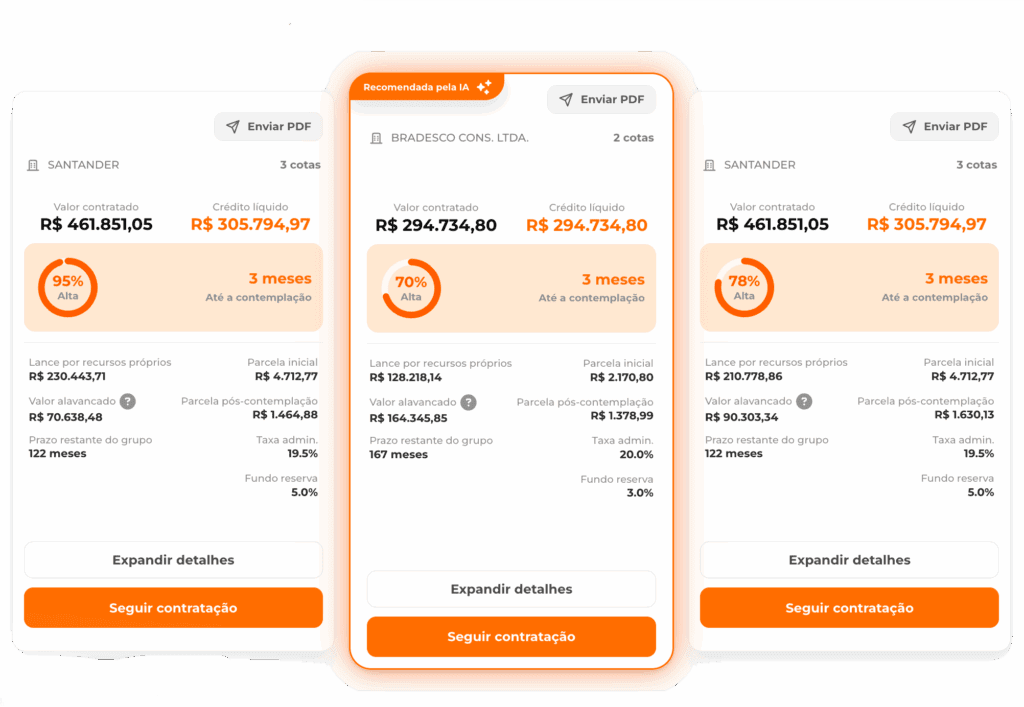 Com acesso às 17 maiores administradoras do Brasil, a ferramenta otimiza o tempo do vendedor, permitindo que ele foque no atendimento e no fechamento de vendas. Além disso, oferece 97% de precisão na previsão de contemplação, o que fortalece a abordagem comercial e aumenta a confiança na negociação.